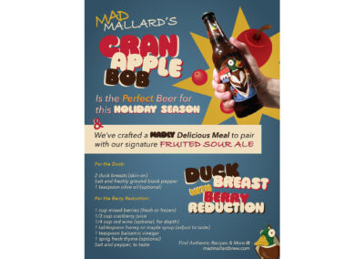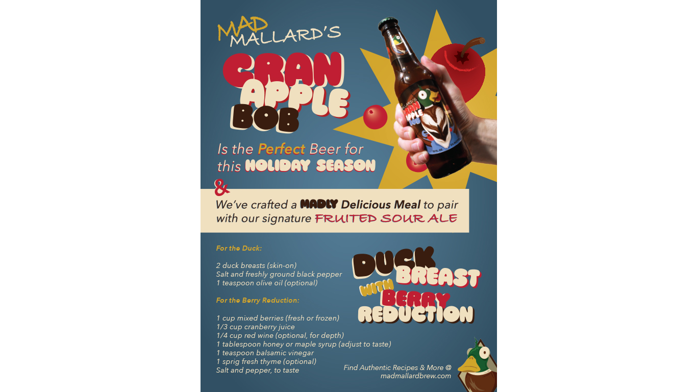 Mad Mallard Brewing is a fictional craft beer brand I created for a beer campaign specializing in sour ales with a focus on seasonal flavors. Its debut concept, Cran-Apple Bob, is a fruited sour ale inspired by the classic Halloween game of bobbing for apples. I designed the beer to appeal to both men and women who enjoy fall and winter-themed beverages, using warm autumnal hues, playful imagery of a mischievous mallard, and engaging visuals that tell a story–first showing the duck bobbing for apples, then spilling the bucket over. I ensured the branding was cohesive, fun, and memorable for the whole campaign, aligning with the trend of craft beer and consumer preferences.